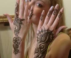 Henna tattoos are applied by squeezing the paste out of small cones directly onto the skin. Much like a cake decorator squeezes frosting onto a cake, henna artists squeeze the paste onto the skin in fine lines. Our henna artists bring design option sheets for each person to choose from. Both very simple or more complex designs can be chosen, and applied to any part of the body other than the face – usually hands, arms, legs or feet. Pregnant bellies or bald heads can also be great spots for henna designs! The henna paste cakes up and dries and must stay on the skin for about an hour, at which point you rub off the paste, and see that the skin has been stained beneath it. At first the dye is light, but becomes darker after several hours or overnight. The design gets darker and more vivid, and stays on the skin for 2-4 weeks!